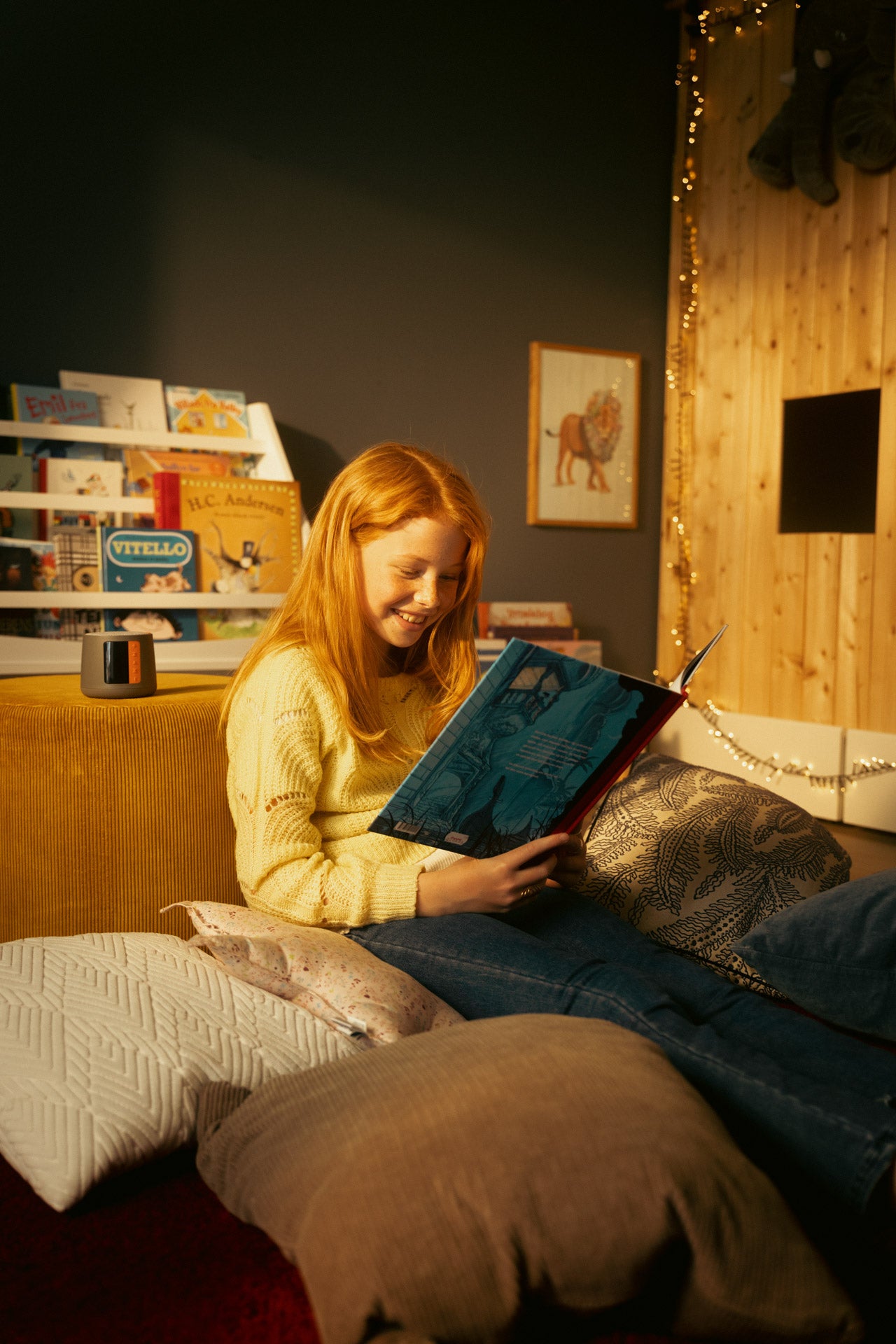 Når barnet tager en bog ned fra hylden og sætter TUK Speakeren på den, afspilles lyden - og den siger endda en pling-lyd*, når barnet skal bladre.