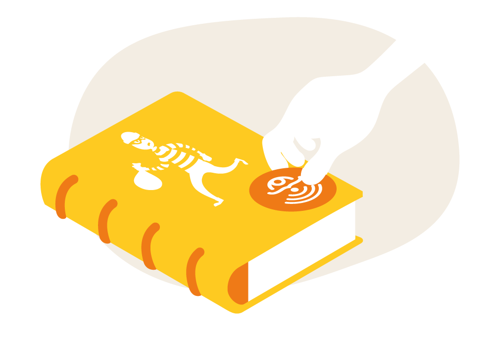 Når barnet tager en bog ned fra hylden og sætter TUK Speakeren på den, afspilles lyden - og den siger endda en pling-lyd*, når barnet skal bladre.